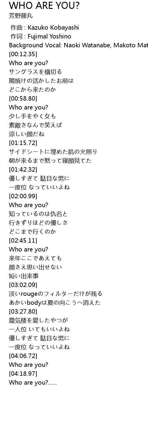 | [00:00.40] | Background Vocal: Naoki Watanabe, Makoto Matsushita, Haruko Kuwana |