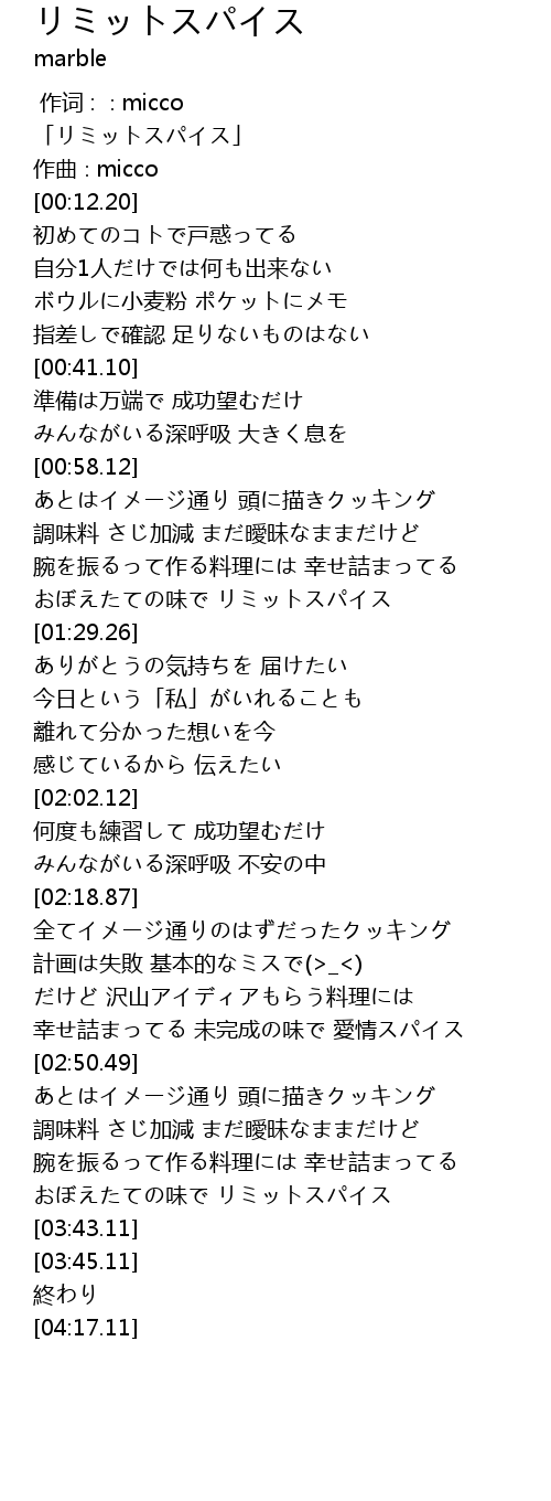 | [03:37.86] | おぼえたての味で リミットスパイス |