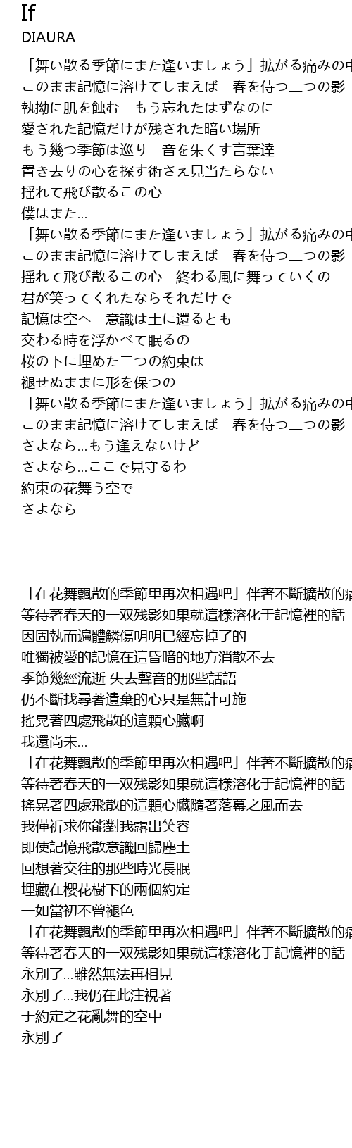 | [03:18.370] | 「在花舞飄散的季節里再次相遇吧」伴著不斷擴散的痛楚 |