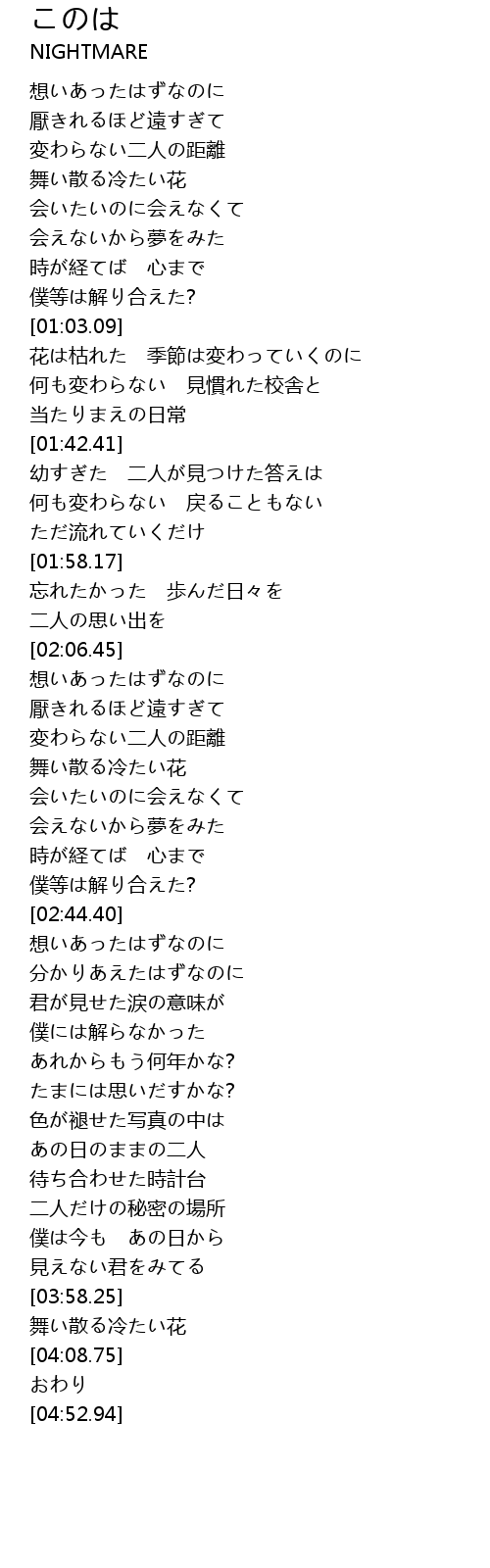| [03:58.84] | 舞い散る冷たい花 |