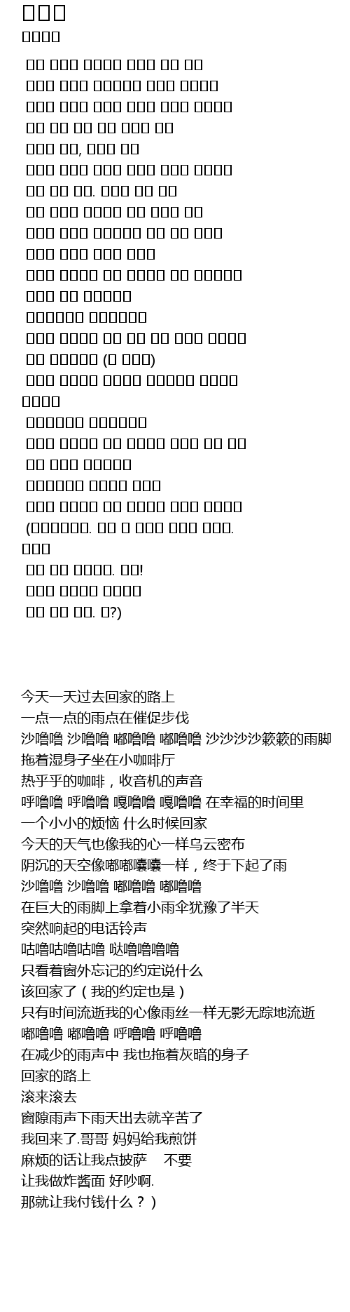 | [00:40.404] | 沙噜噜 沙噜噜 嘟噜噜 嘟噜噜 沙沙沙沙簌簌的雨脚 |
