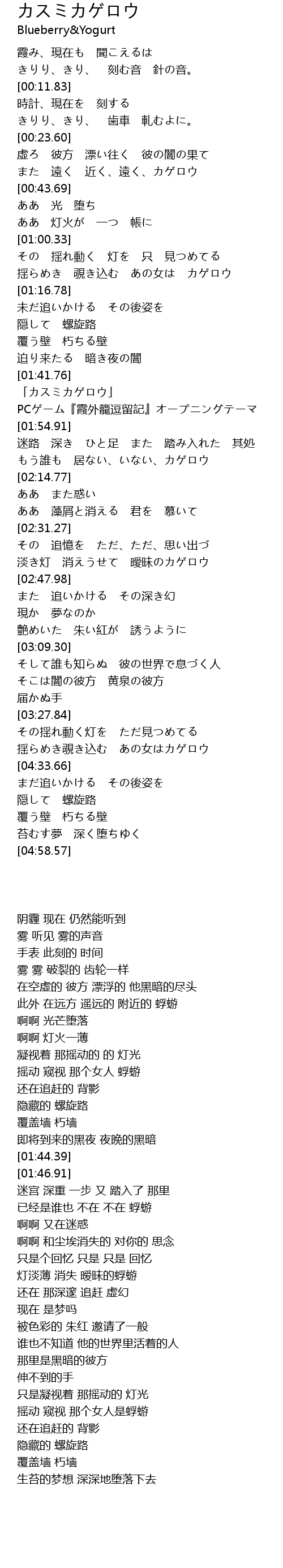| [01:46.91] | PCゲーム『霞外籠逗留記』オープニングテーマ |