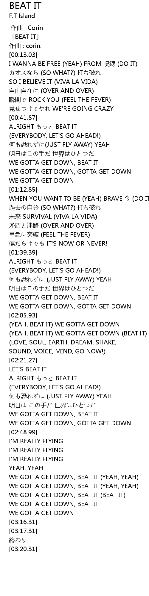| [03:01.48] | WE GOTTA GET DOWN, BEAT IT (YEAH, YEAH) |