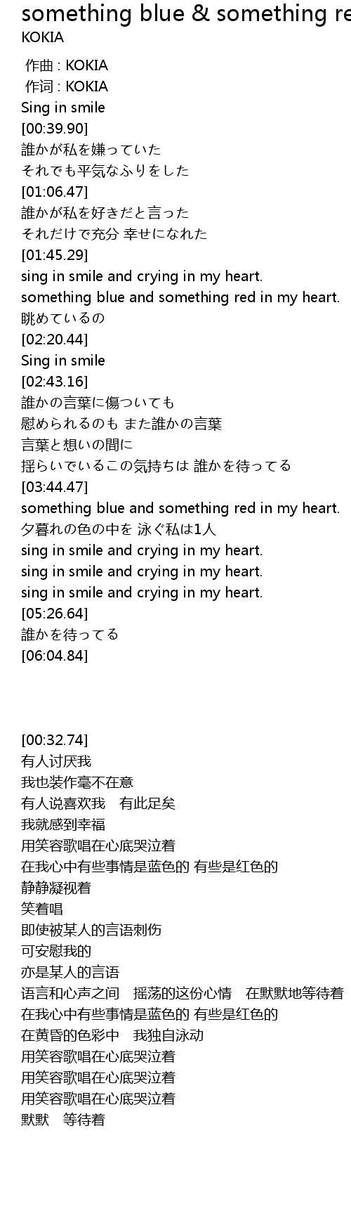 | [05:18.73] | 用笑容歌唱在心底哭泣着 |