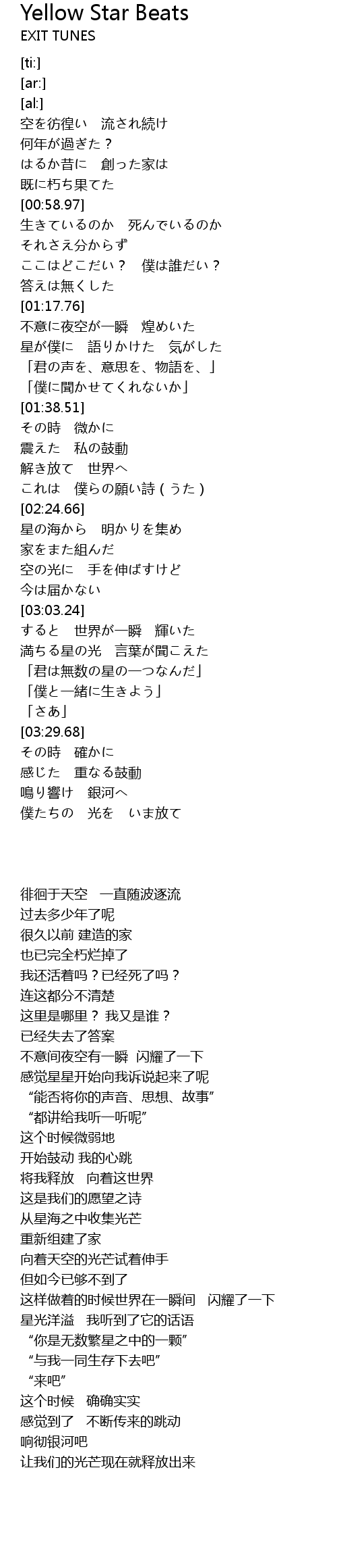 | [01:22.66] | 星が僕に 語りかけた 気がした |