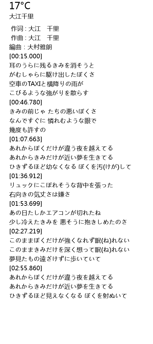 | [02:56.332] | あれからぼくだけが違う夜を越えてる |