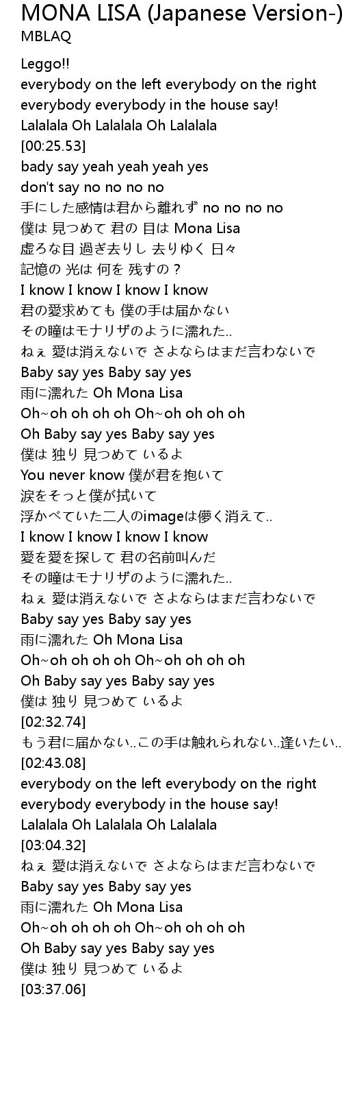 | [00:34.09] | 僕は 見つめて 君の 目は Mona Lisa |