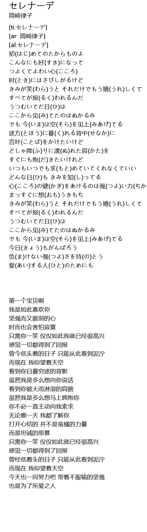 | [02:13.69] | 心(こころ)の键(かぎ)をあけるのは强(つよ)い力(ちから)じゃなく |