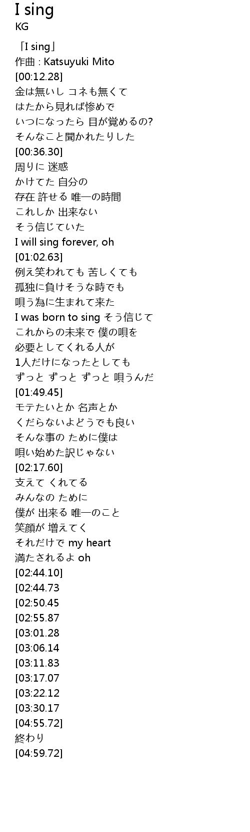 | [03:57.39][03:01.28] | I was born to sing そう信じて |