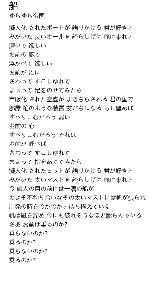 | [00:08.51] | 擬人化 されたボートが 語りかける 君が好きと |