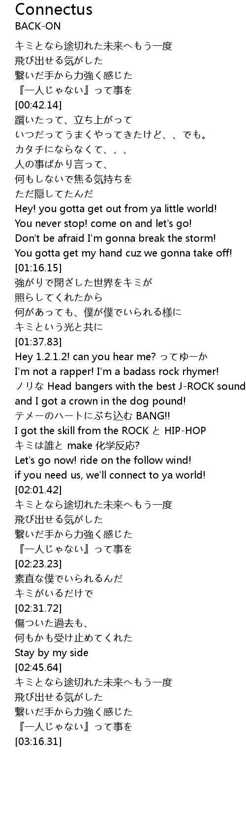 | [01:59.04] | if you need us, we' ll connect to ya world! |