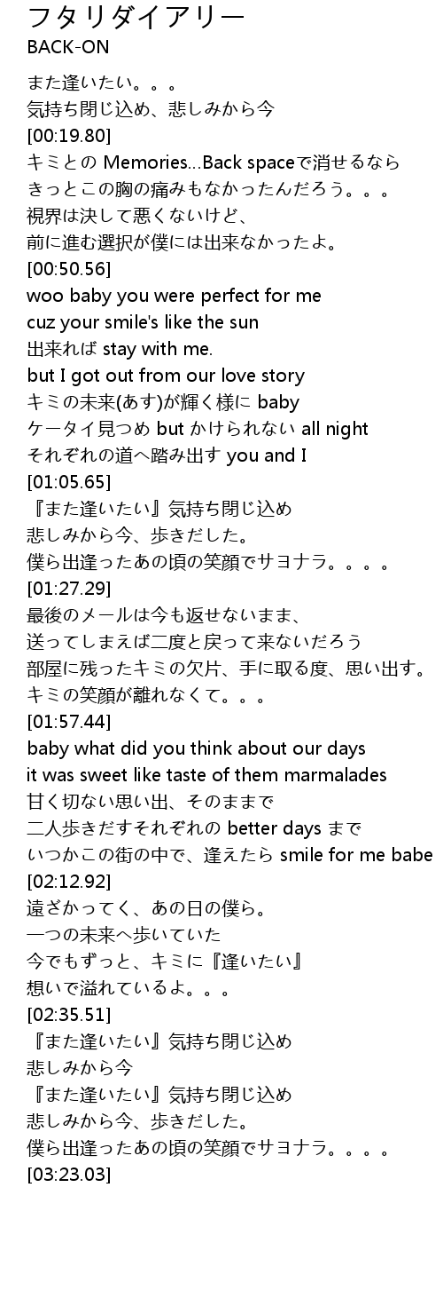 | [02:08.69] | いつかこの街の中で、逢えたら smile for me babe |