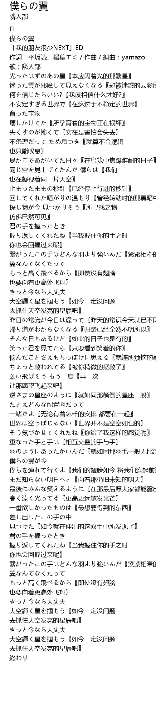 | [02:38.500] | 僕らの翼が今 僕らを連れて行くよ〖我们的翅膀如今 将我们连起前进〗 |