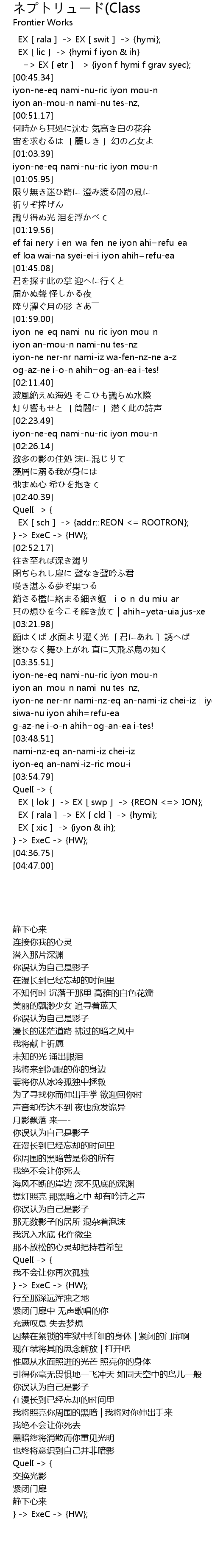 | [03:41.97] | iyon-ne ner-nr nami-nz-eq an-nami-iz chei-iz|iyon-re wa-fui-i siwa-nu iyon ahih=refu-ea |