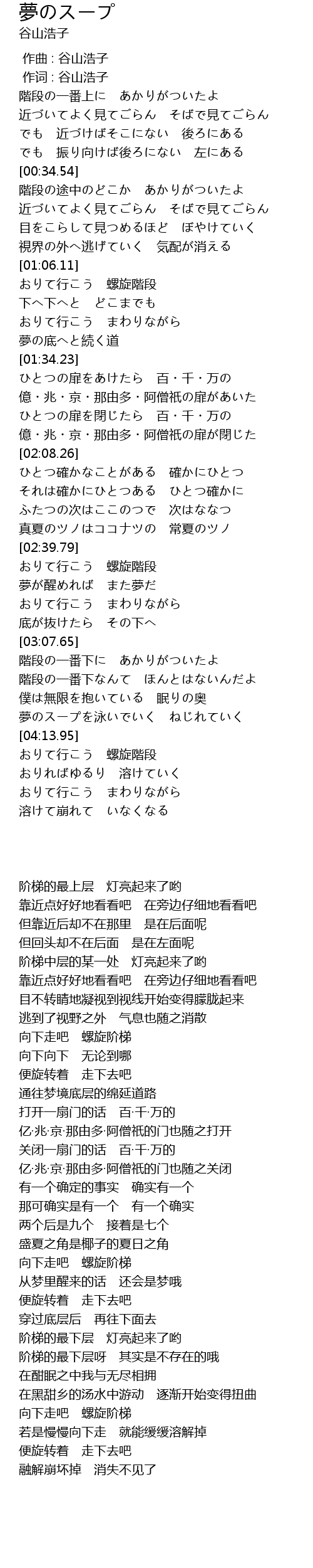 | [04:07.16] | 夢のスープを泳いでいく ねじれていく |