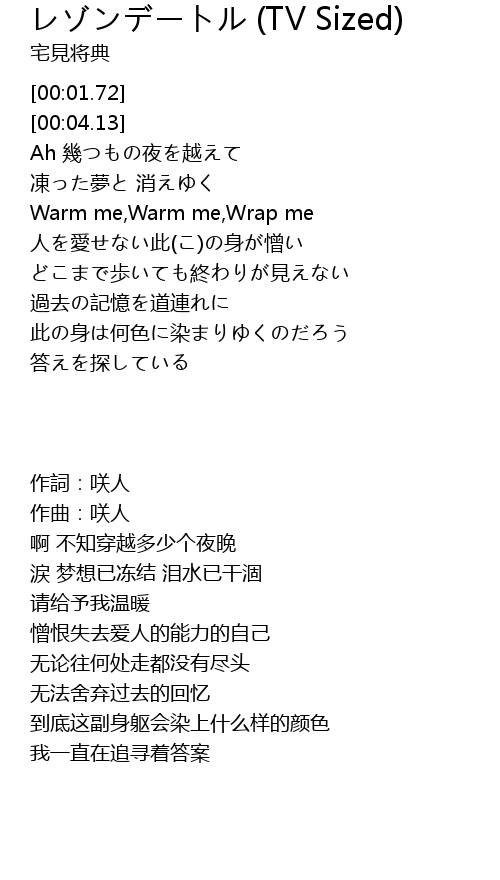 | [00:27.18] | 人を愛せない此(こ)の身が憎い |