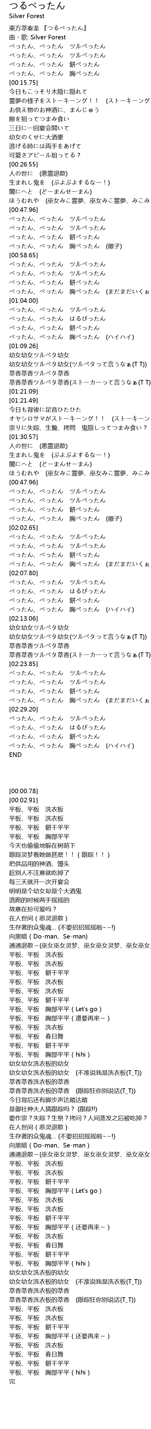 | [00:00.78] | 東方萃奏楽 『つるぺったん』 |