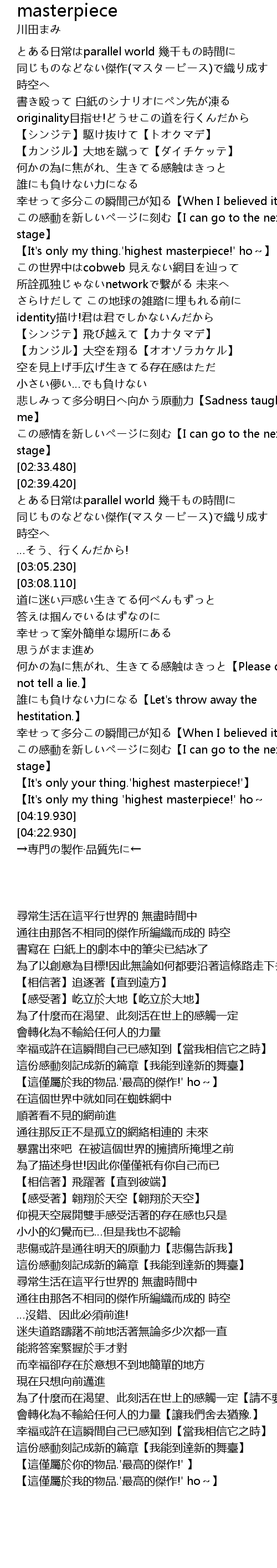 | [02:52.960] | 同じものなどない傑作(マスターピース)で織り成す 時空へ |