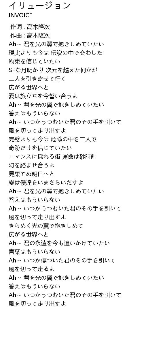 | [01:01.70] | Ah~ 君を光の翼で抱きしめていたい |