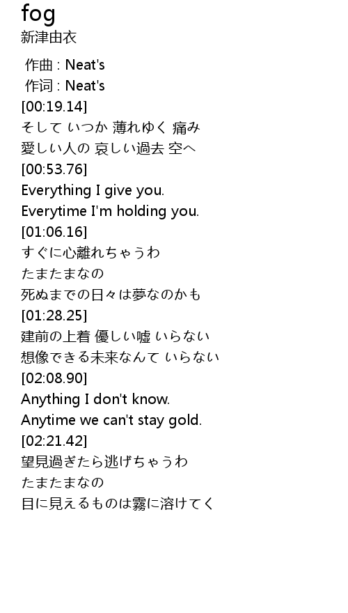 | [02:30.12] | 目に見えるものは霧に溶けてく |