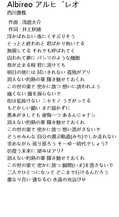 | [02:08.93] | この世の果て 密かに放つ 想い逃がさないで |