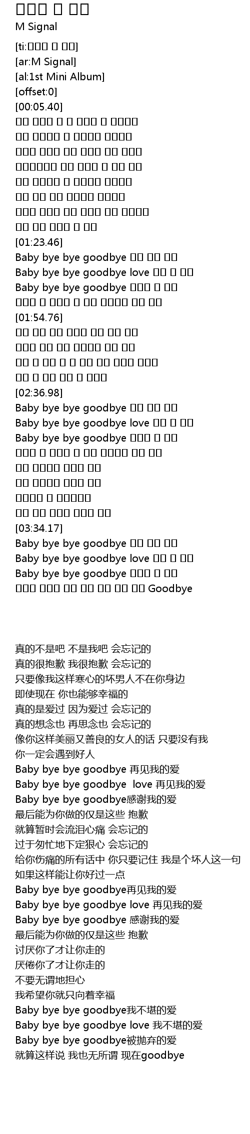 | [01:31.35] | Baby bye bye goodbye love 안녕 내 사랑 |