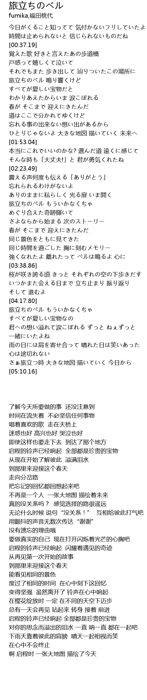 | [01:01.54] | 旅立ちのベル 鳴り響くけど すべてが愛しい宝物だと |