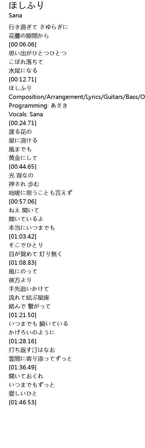 | [00:15.99] | Composition/Arrangement/Lyrics/Guitars/Bass/Other Instruments & Programming: あさき |