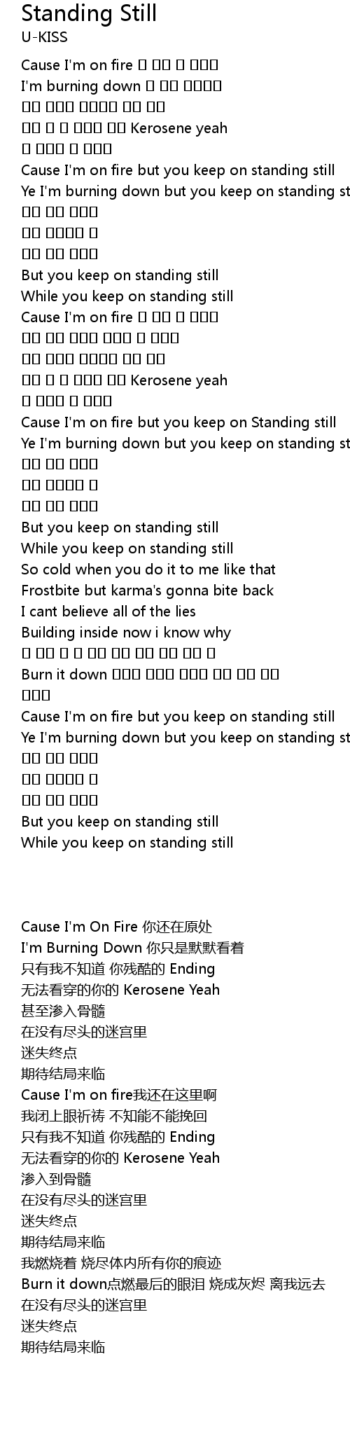 | [01:41.750] | Cause I'm on fire but you keep on Standing still |