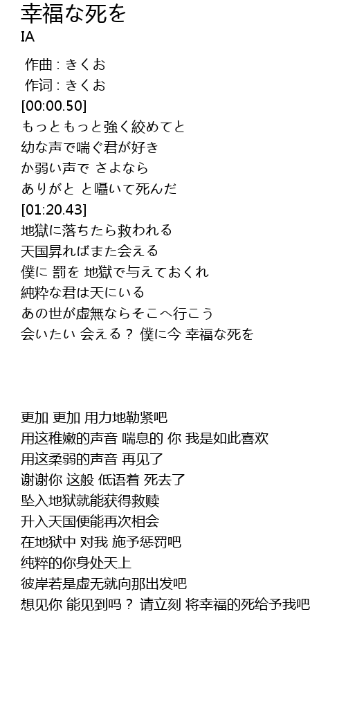| [01:46.54] | 想见你 能见到吗? 请立刻 将幸福的死给予我吧 |