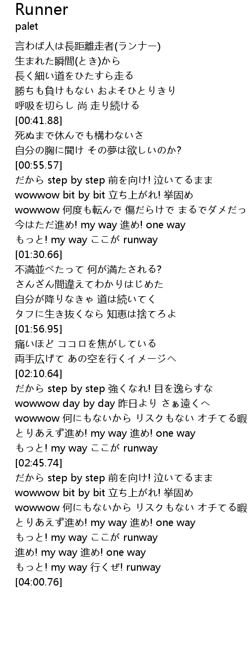 | [03:55.96] | もっと! my way 行くぜ! runway |