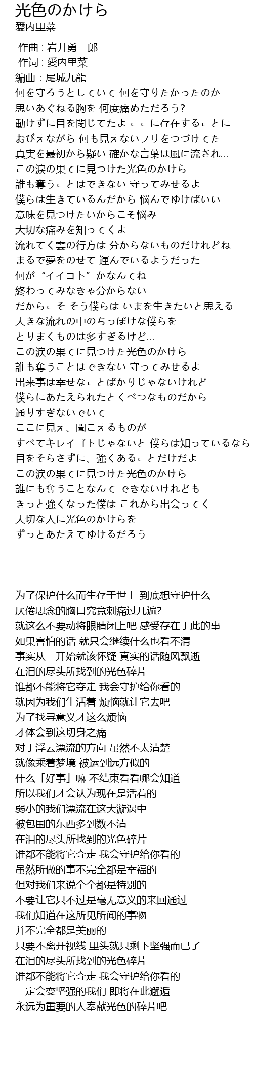 | [02:34.19] | この涙の果てに見つけた光色のかけら |