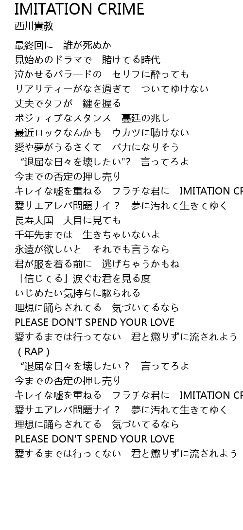 | [03:46.23] | キレイな嘘を重ねる フラチな君に IMITATION CRIME |