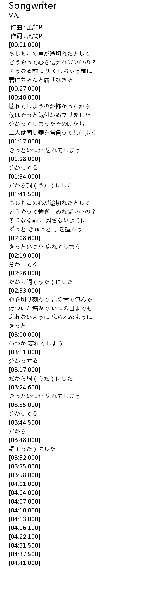 | [02:34.000] | 心を切り刻んで 言の葉で包んで |
