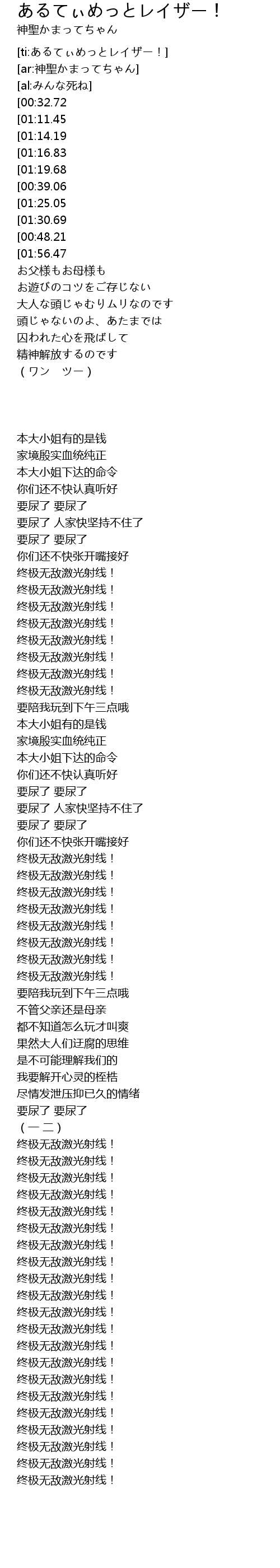| [00:45.20][00:48.21][00:50.86][00:53.77][00:56.43][00:59.12][01:01.81][01:04.45][01:34.74][01:37.34][01:40.08][01:42.80][01:45.56][01:48.28][01:50.96][01:53.72][02:50.60][02:53.23][02:55.93][02:58.62][03:01.37][03:04.02][03:06.68][03:09.42][03:12.17][03:14.76][03:17.49][03:20.20][03:22.94][03:25.80][03:28.45][03:31.08][03:33.70][03:36.43][03:39.06][03:41.62][03:44.32] | あるてぃめっとレイザー! |
