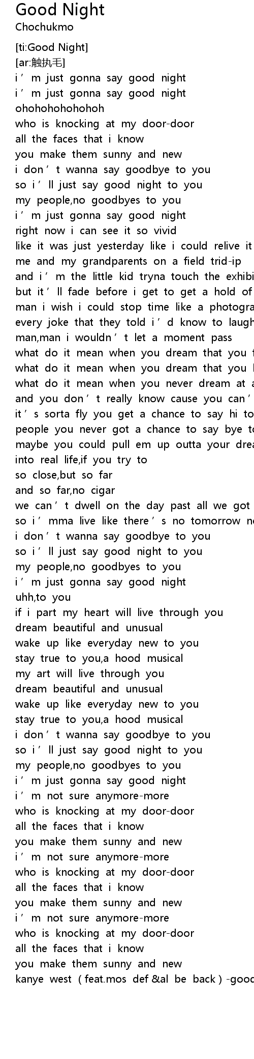 | [04:45.462] | kanye west (feat.mos def &al be back)-goodnight |