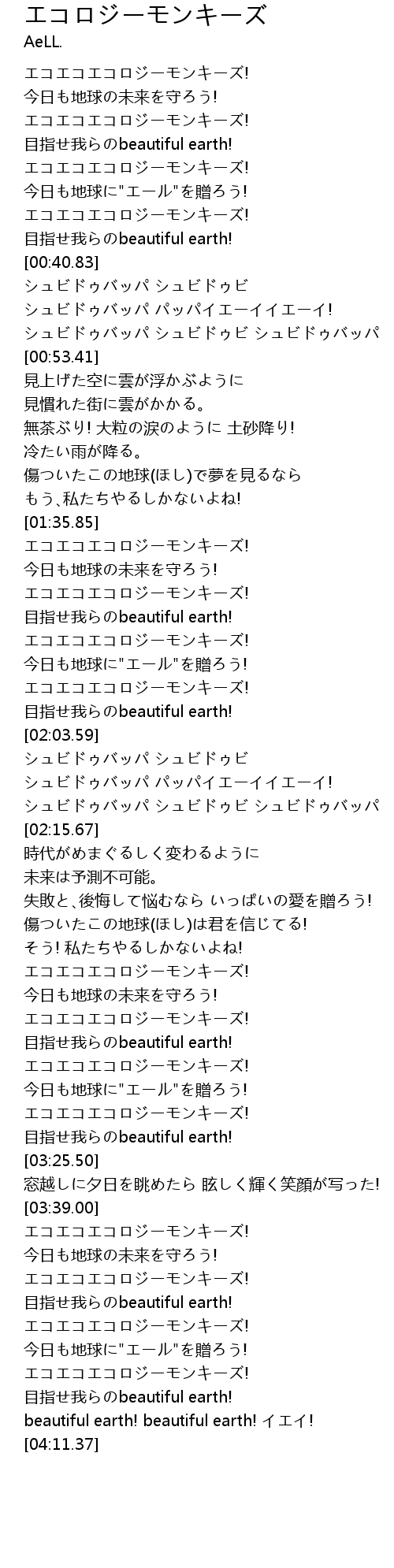 | [03:19.00] | エコエコエコロジーモンキーズ! 目指せ我らのbeautiful earth! |