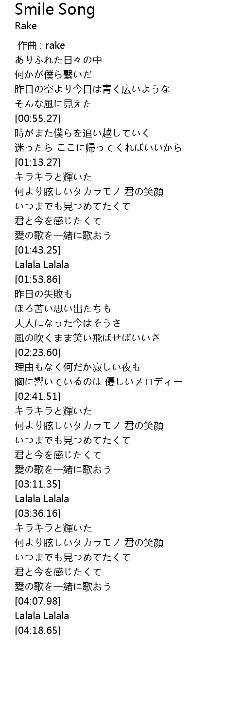 | [03:43.83] | 何より眩しいタカラモノ 君の笑顔 |