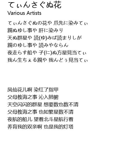 | [00:11.950] | てぃんさぐぬの花や 爪先に染みてぃ |