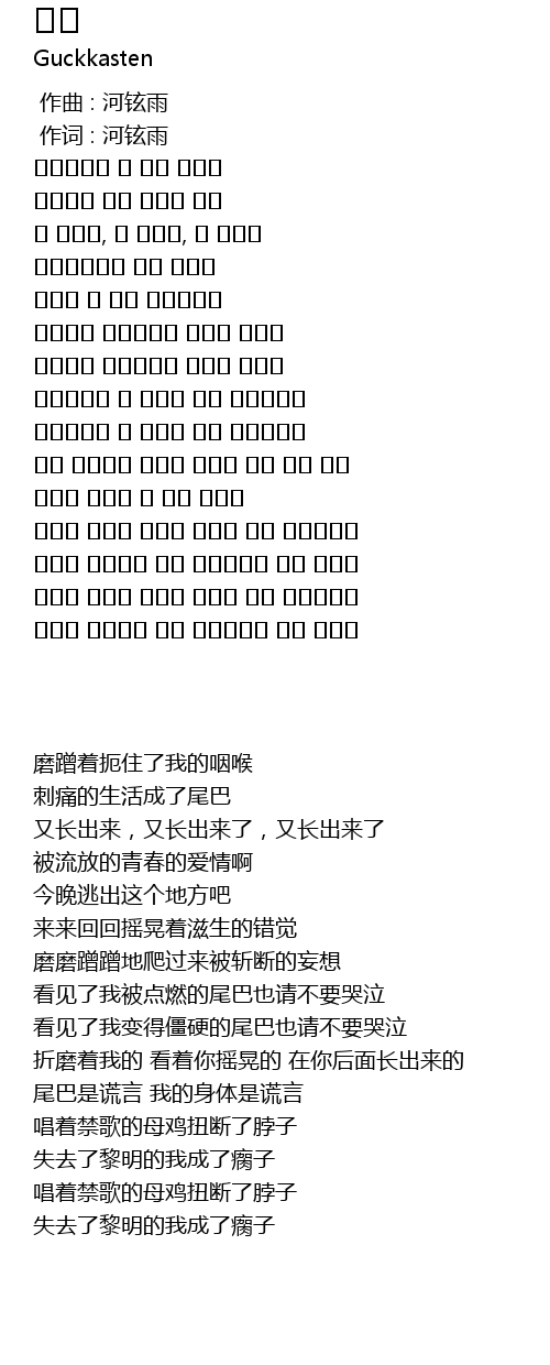| [02:19.28] | 금지된 노래를 부르던 암탉의 목은 비틀어지고 |