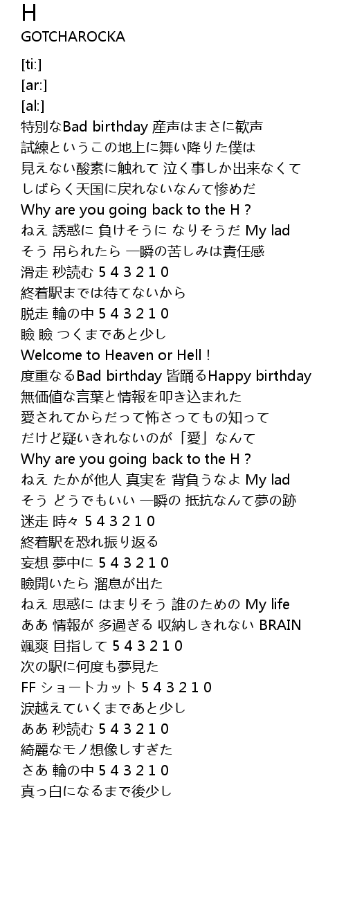 | [01:55.39] | 度重なるBad birthday 皆踊るHappy birthday |