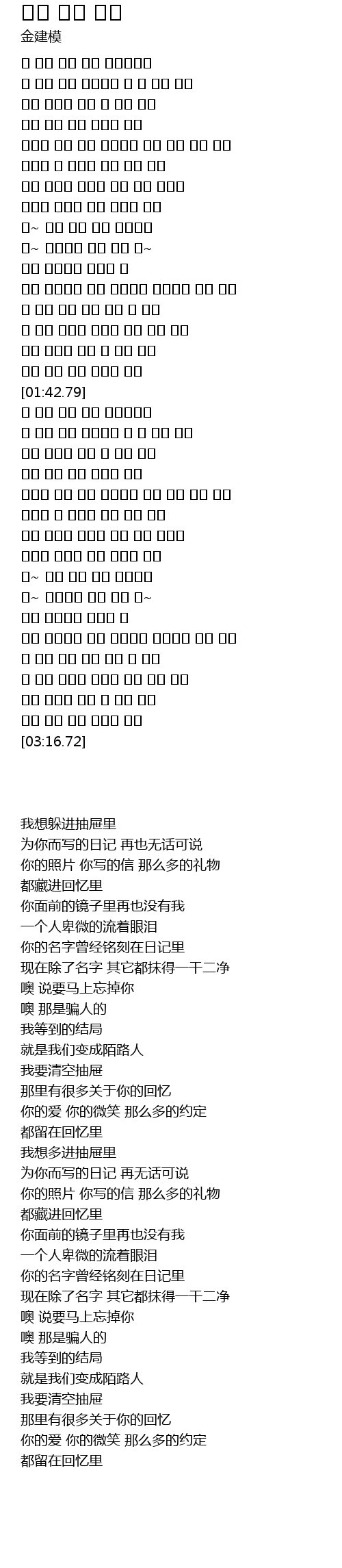 | [00:38.26] | 너의 사진과 편지 그 많은 선물 |