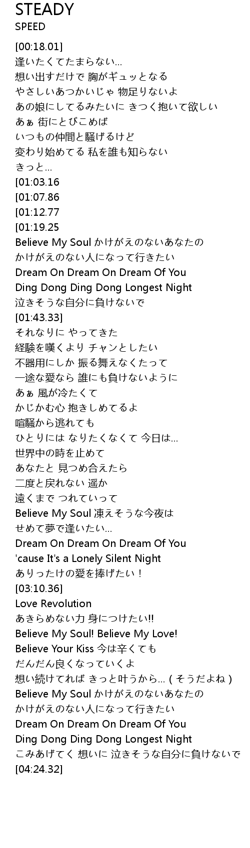 | [04:00.09] | Believe My Soul かけがえのないあなたの |