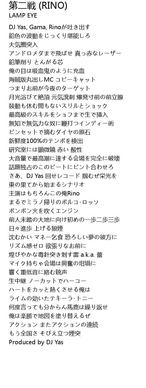 | [00:11.20] | DJ Yas, Gama, Rinoが吐き出す |