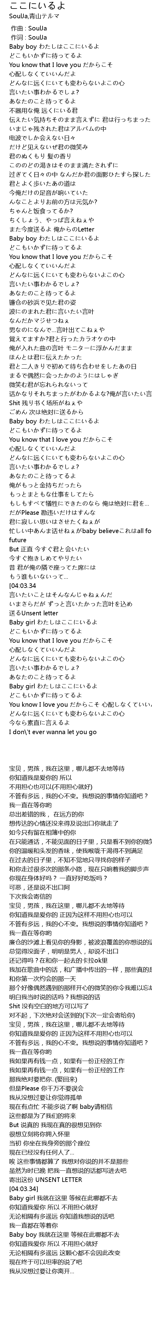 | [02:53.05] | Baby boy わたしはここにいるよ どこもいかずに待ってるよ |