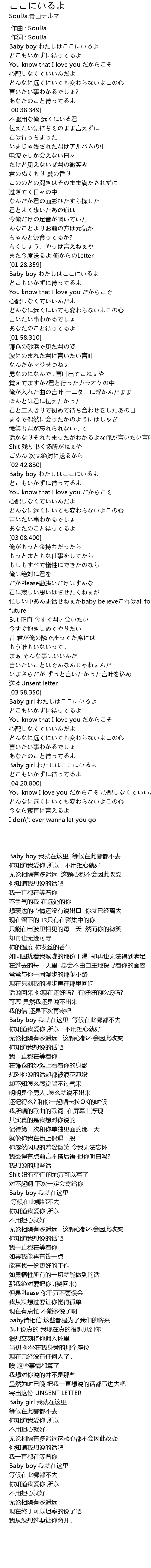 | [00:11.340] | Baby boy わたしはここにいるよ どこもいかずに待ってるよ |