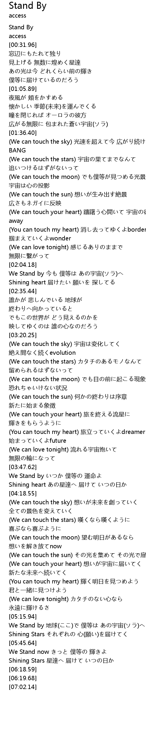 | [02:04.47] | We Stand by 今も 僕等は あの宇宙(ソラ)へ |