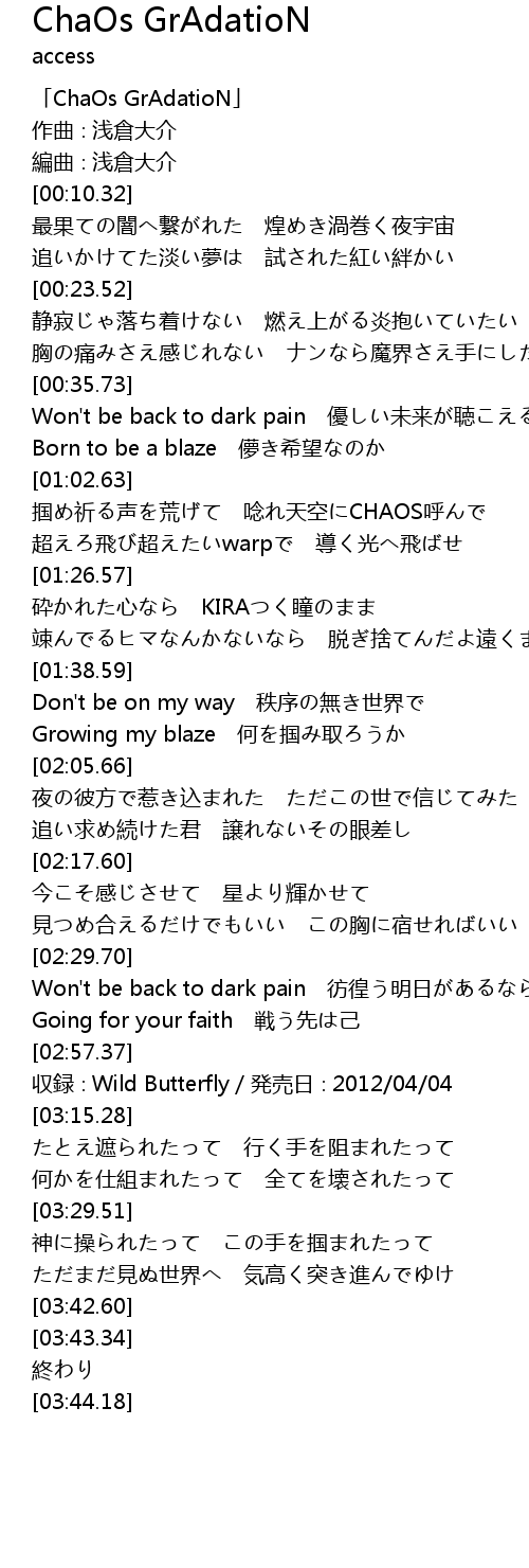 | [03:01.28] | 収録∶Wild Butterfly/発売日∶2012/04/04 |