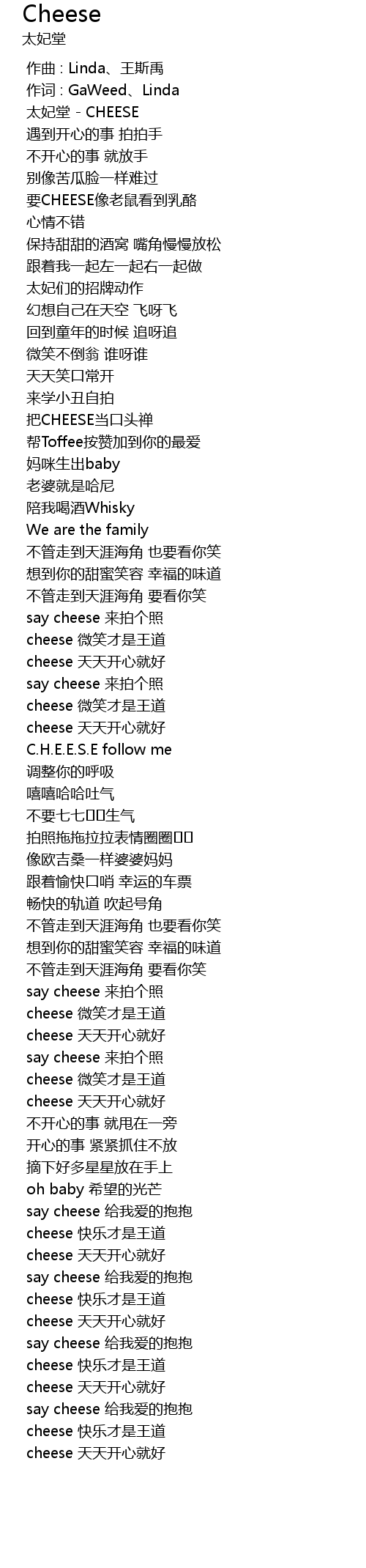 | [02:17.99] | cheese tiān tiān kāi xīn jiù hǎo |