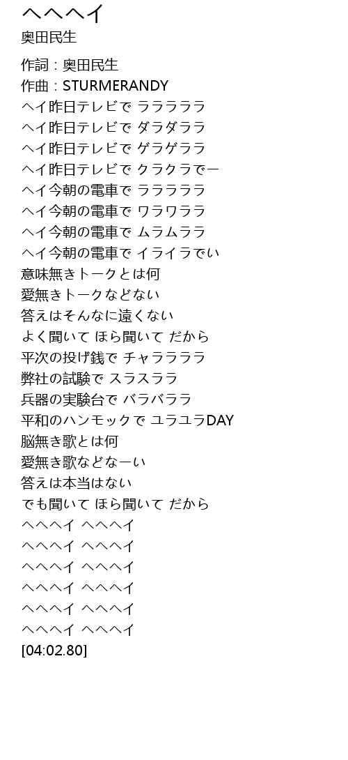 | [03:42.84] | ヘヘヘイ ヘヘヘイ |